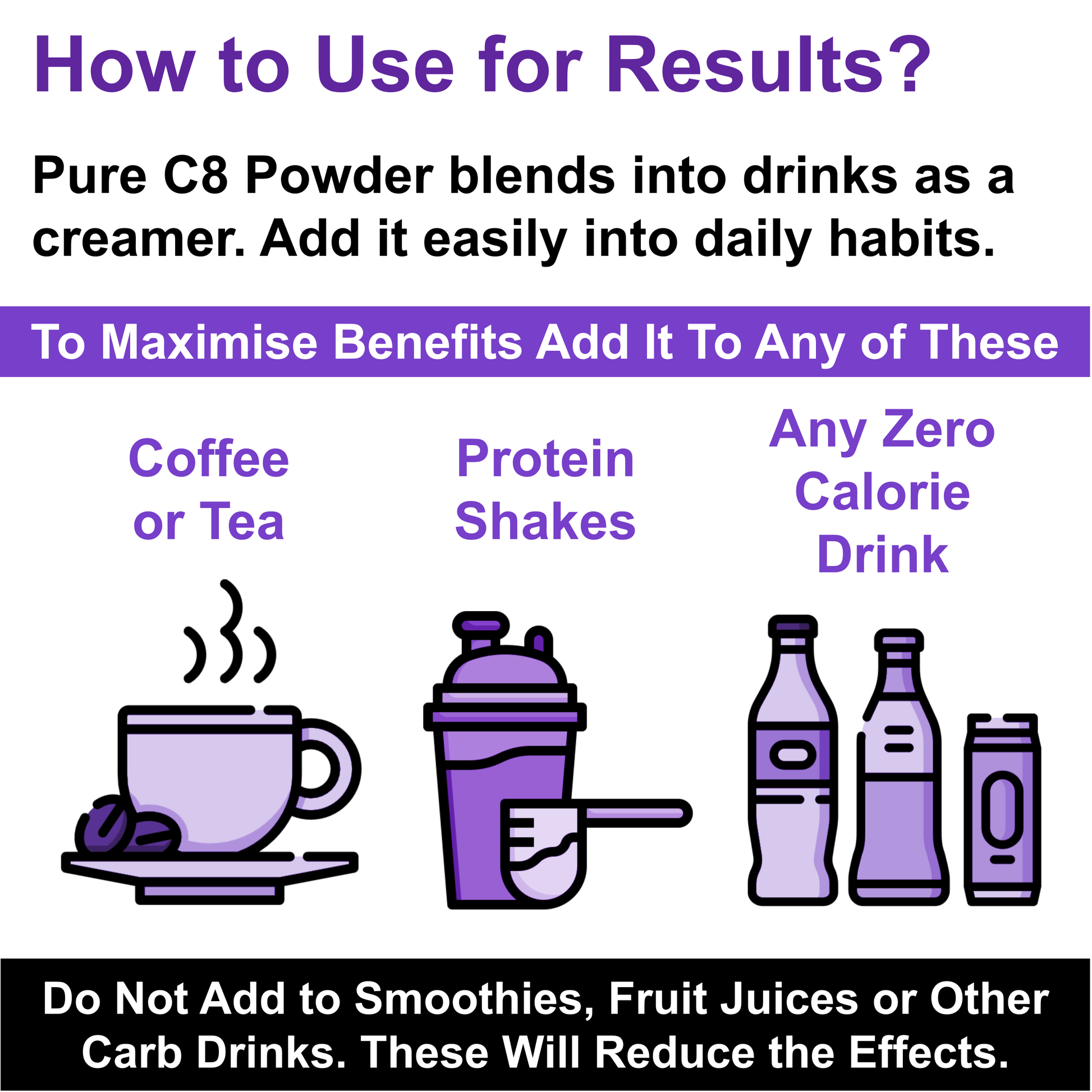 من الأفضل استخدام مسحوق Pure C8 MCT في المشروبات حيث يعمل كمبيض. وغالبا ما يستخدم ليحل محل الحليب والقشدة أو الزبدة في القهوة أو الشاي.